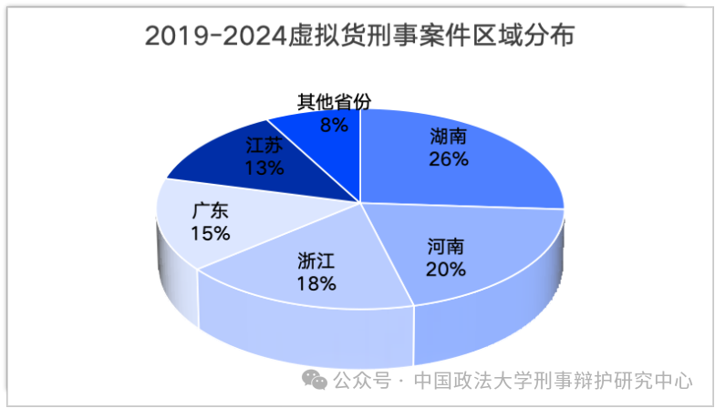 虚拟货币具有去中心化、匿名性强、跨国流通便捷等特点,一方面引发了大众投资热潮,另一方面也为不法分子提供了新的犯罪手段和洗钱工具。近年来,随着区块链和虚拟货币技术的发展,围绕虚拟货币的刑事案件数量快速增长。虚拟货币已渗透进职务犯罪、电信诈骗、非法集资、网络赌博、黑灰产等犯罪领域,成为“币圈”违法行为的重要载体,同时以“虚拟币”为名实施的传销案件,以及围绕空气币、山寨币等虚拟币本身的案件呈高发态势。值得注意的是,涉虚拟货币犯罪在地域分布上呈现一定聚集性。例如,对2019-2024年间2200余份相关刑事判决分析发现,湖南、河南、浙江等省份案例数量位居前列(见下图)。