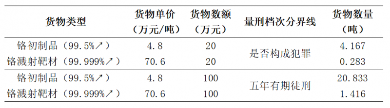 在涉及高附加值产品的犯罪行为不法评价中,应当明确技术的中立性,即高附加值产品的技术溢价属于合法市场行为,不应成为加重刑罚的归责基础。以“溅射靶材”系列案为例,走私对象中占比最大的是铬制品,涉案货物从技术附加值角度分析具有“原材料—初级加工品—溅射靶材”的技术跃迁特征,如若机械适用“数额”量刑标准,无疑将产生荒诞的罪刑倒挂现象(如下表所见,同档次量刑对应的“数量”标准相差14.7倍),相较于直接破坏国家资源管控大局的直接型资源外流,通过高附加值技术加成后的“溅射靶材”却“因技术而死”,辛苦发展的技术最终却成为“自杀的毒药”,量刑如此不相适应,显然违背资源性货物出口管制的制度目的,也与刑法罪责刑相适应原则相悖。