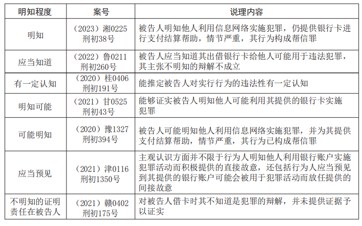 一方面,部分样本将“明知”的内容由“信息网络犯罪”降低为“违法犯罪活动”或“犯罪活动”,部分样本甚至将标准降低为“明知干违法的事情”或“具有非法买卖银行卡的故意”(如张某帮信案,以下简称案例1)。在此基础上,结合“推定”及“可能性”,以行为人具有认知能力,推定其可能认识到行为违法来论证“明知”,进一步模糊了“明知”的内容。有观点认为,长此以往,帮信罪有沦为“促进违法犯罪实施罪”的风险。另一方面,在向他人提供银行卡的行为中,对流水金额是否属于“明知”内容存在分歧,部分样本认为,流水金额仅为客观量刑要素,行为人是否明知不影响定罪量刑;部分样本以公诉机关未能证明行为人在某一时间段对银行卡的使用情况有认识为由,对该时间段内的转账金额予以排除。