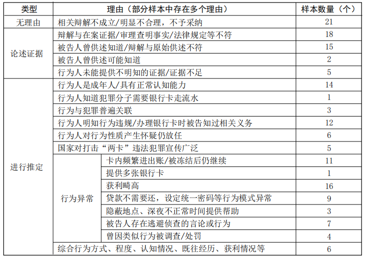 其一,说理回应充分性不足。88.26%的样本在事实认定及说理部分只论述客观行为或直接表述行为人具有明知,缺少对行为人主观明知情况及认定明知理由的说明。对于被告人以不明知为辩解的525个样本中,85.52%的样本在说理部分未予回应,回应的样本中27.63%仅表述“辩解不成立,不予采纳”的结论,而未论述理由。其二,证据链条完整性不足。样本中认定明知普遍缺少直接证据和客观证据,部分样本仅以行为人曾供述“意识到提供银行卡中的钱可能是违法犯罪的钱”证明行为人明知是信息网络犯罪所得,部分样本中存在没有证明“明知”的证据即认定的情况。其三,推定路径逻辑性不足。多数样本在简单说明案件情况后直接认定行为人明知;在说理中回应被告人不明知辩解的样本中,18.42%以行为人是成年人或具有正常认知能力为由;15.79%以行为人明知行为违规为由;部分样本以行为人知道犯罪分子需要银行卡走流水、国家对打击“两卡”违法犯罪宣传广泛等为由推定行为人明知(见表1)。综上,上述现象表明实践中存在从行为人实施帮信行为直接推定“明知”的问题,此类推定实质上虚置了主观要件,存在客观归罪倾向。