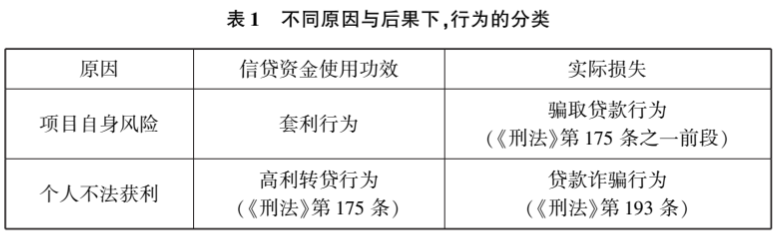 结合转贷经营行为的两重视角,可以把行为人获取金融机构信贷资金所生后果区分为抽象危险和实害结果,抽象危险系指未能有效发挥信贷资金使用功效,致使作为信贷资金的货币政策调节工具有效性的丧失。实害结果系指名义或者实际借款人逾期,致使金融机构信贷资金遭受损失;可以把后果发生的原因区分为项目自身风险和个人不法获利,项目自身风险系指信贷资金虽与约定用途不一致却真实使用,不法获利系指行为人追求财产利益的不法性。根据“原因—结果”范式的两两组合,一共存在四种情况,参见表1: