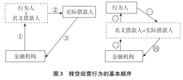 通过上述行为差异的比较,可以阐明转贷经营行为的基本顺序:一行为人向实际借款人垫付资金并签订与信贷资金数额一致的拆借协议;二行为人作为名义借款人向金融机构申请信贷资金;三在获取信贷资金后以受托支付或者转账方式将资金转入行为人账户完成资金拆借协议的履行;四由实际借款人向金融机构偿还贷款及利息。两者的行为结构可参见图3: