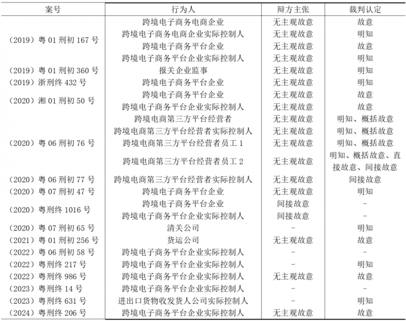 从以上典型案例可见,客观上实施走私行为的行为人,尤其是为他人以低报价格方式实施走私普通货物、物品罪提供帮助的“推单”行为人,会出现对他人提供的货物的价格数据未进行严格审核与纠正的情形。此种情况中相关行为人亦多以强调证据不足,无法证明行为人对低报价格知情或推定知情,且因早期海关对推单模式的默许等新兴行业特点导致违法性认识错误等为由,主张主观上无明知而弱化或否认行为人存在走私犯罪的故意。而法院对于行为人提出的“无主观故意”的回应不一致,甚至将同一行为人的主观故意认定为“明知”“概括故意”“直接故意”“间接故意”等。