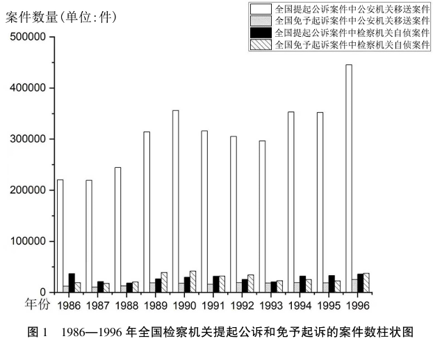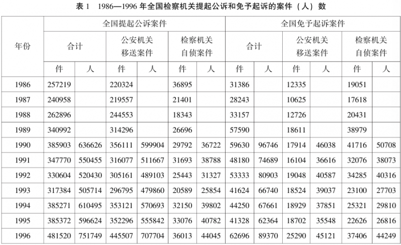免予起诉制度产生之初的功能是为贯彻“惩办与宽大相结合”的政策,分化瓦解犯罪分子,争取大多数,打击极少数。为延续该功能,免予起诉制度在入法后应当主要适用于集团犯罪和共同犯罪中的从犯或胁从犯,以及犯罪情节轻微不需要判处刑罚的行为人。然而,从司法实践看,这些案件在免予起诉案件总量中所占的比例较小,免予起诉制度的适用范围比较有限。1979年《刑事诉讼法》除了确立免予起诉制度外,还赋予检察机关自侦权,“贪污罪、侵犯公民民主权利罪、渎职罪以及人民检察院认为需要自己直接受理的其他案件,由人民检察院立案侦查和决定是否提起公诉”。本文通过对《中国法律年鉴》中所列举的全国检察机关从1986年到1996年间提起公诉和免予起诉的案件(人)数进行统计和对比,发现免予起诉制度主要适用于检察机关自行侦查(以下简称自侦)的案件。
