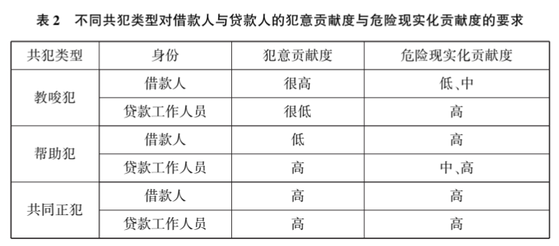 教唆犯强调行为人对正犯犯意从无到有地引起,因此对于借款人的犯意贡献度要求很高;帮助犯强调行为人对法益侵害结果的促进作用,因此对于借款人的危险现实化贡献度要求较高。但二者的差别在于,帮助犯情形中,借款人并未使贷款工作人员产生实施违法发放“数额巨大”贷款行为的意思,只是提供了心理或物理上的帮助。共同正犯强调行为人在犯罪中起到重要作用,对于借款人的犯意贡献度与危险现实化贡献度的要求均较高(详见表2)。