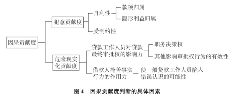 危险现实化贡献度主要指在内外勾结骗取贷款过程中,贷款工作人员与借款人在客观上对于成功骗取贷款“数额巨大”这一结果的影响力。既包括贷款工作人员对于贷款最终审批权的影响力大小,如贷款工作人员职务的决策权大小、其他影响审批权行为的有效性程度等,也包括借款人为取得贷款所做的掩盖事实行为的作用力大小,例如借款人的欺诈手段使一般贷款工作人员陷入认识错误的可能性大小等因素。
