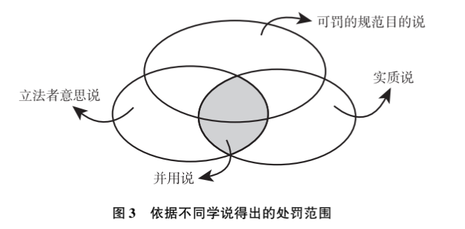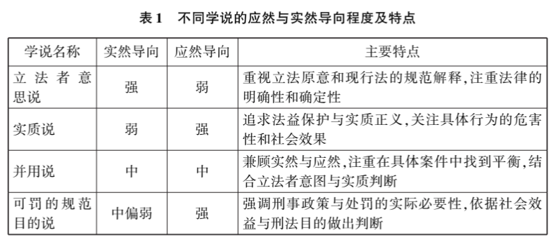 对于前述问题,理论上主要存在立法者意思说、实质说、并用说、可罚的规范目的说等不同学说(见表1)。