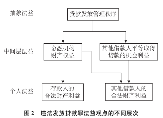 关于法益的分类,德国刑法学形成了法益一元论和二元论之争。二元论代表如克劳斯·梯德曼(Klaus Tiedemann)认为个人法益与超个人法益为质量不同的两个种类,经济刑法体系或者其他刑法体系,可以独立于个人法益所形成的刑法体系,因此,可以将经济法益(超个人法益)予以抽象化,并且将经济秩序的维护与保护列为刑法的另一“自我目的”。一元论的代表如米歇尔·马克斯(Michael Marx)认为,超个人法益其实是个人法益的衍生,其本质也是个人法益,只具有“传导出来的机能”。由于违法发放贷款罪涉及“整体有序的贷款发放秩序的维护”与“特定个人通过破坏秩序为自己或他人牟取贷款利益”之间的利益冲突,本文认为在此情境下采用法益二元论更为妥当。前述单一法益论中的金融管理秩序与贷款管理制度实际上都属于超个人法益,均存在过于抽象宽泛的问题。其中,金融管理秩序说无法将本罪与破坏金融管理秩序一节的其他罪名相区分,而贷款管理制度或贷款管理秩序说虽然相较“金融秩序”将范围限缩至“贷款秩序”,但仍较宽泛,无法与骗取贷款罪、贷款诈骗罪等的保护法益相区分。复合法益论中,几种不同观点的差别之处在于,将法益还原至个人的具象程度不同,最为核心的分歧在于是否应当只关注金融机构的财产权益,抑或仍需由金融机构的财产安全进一步延伸至存款人的合法利益,同时由贷款发放秩序的维护延伸至其他借款人的公平贷款机会利益。本文认为,根据法益的具体程度,可以将现有观点中的法益内容分为抽象法益、中间层法益、个人法益。其中,个人法益除了存款人的合法财产利益,还可以包含借款人取得贷款后由此产生的合法财产权益,此可视为其他借款人的平等机会利益背后的本质利益(详见图2)。