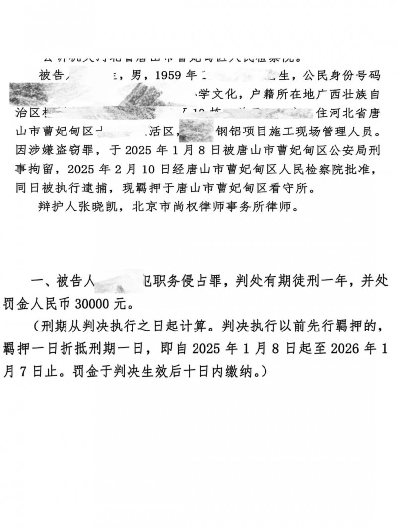 2025年1月初,罗某某作为某项目施工现场施工队管理人员,与废品收购人员王某某合意,三次将堆置于工地的钢筋装车外运出售。前两次既遂,第三次装车过程中被保卫人员当场制止。经价格认定,案涉钢筋价值33万余元。公安机关以涉嫌盗窃罪对其刑事拘留,检察机关亦以盗窃罪批准对其逮捕。经审查起诉阶段辩护人与公诉机关充分沟通与法律论证,唐山市曹妃甸区人民检察院于2025年9月以职务侵占罪提起公诉。2025年12月,曹妃甸区人民法院作出(2025)冀0209刑初338号刑事判决,认定罗某某构成职务侵占罪,判处有期徒刑一年,并处罚金。