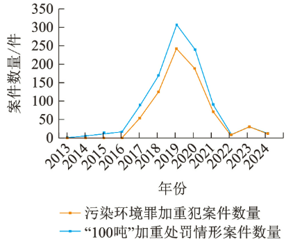 图1 2013—2024年污染环境罪加重犯和“100吨” 加重处罚情形案件数量